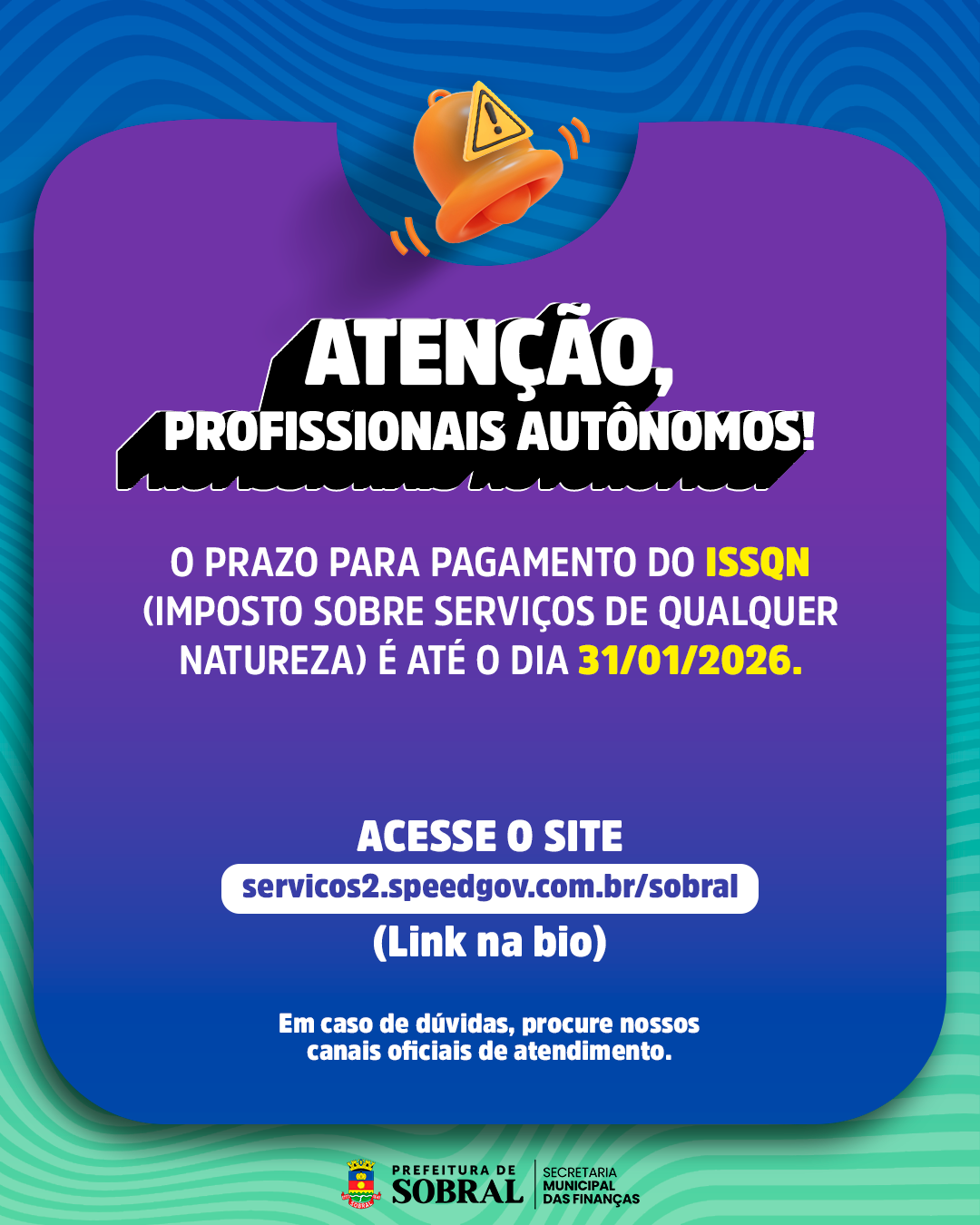 A Prefeitura de Sobral, por meio da Secretaria das Finanças (SEFIN), alerta os profissionais autônomos sobre o vencimento do Imposto Sobre Serviços de Qualquer Natureza (ISSQN), que ocorre no dia 30 de janeiro de 2026. O ISSQN é um tributo municipal essencial para a regularização da atividade profissional e contribui diretamente para a manutenção dos serviços públicos oferecidos à população.